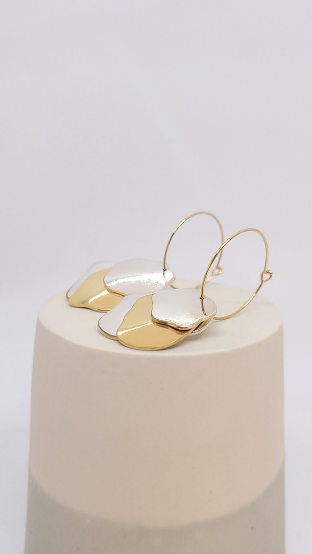 Découvrez l'élégance pétillante des créoles asymétriques Nuages, une pièce phare de notre collection. Ces boucles d'oreilles en laiton tout en courbes dorées et argentées scintillent autour de votre visage et réhaussent votre beauté naturelle. Elles sont fabriquées à la main dans notre atelier parisien.