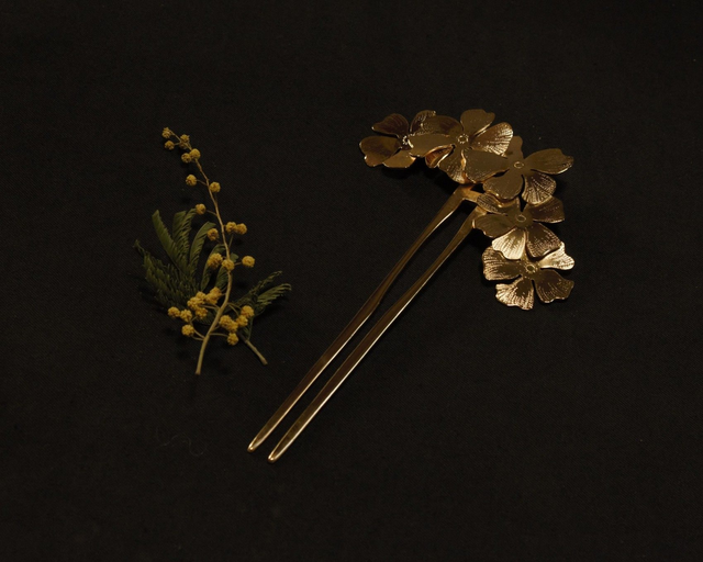 Optez pour l'élégance nippone avec le pic à chignon Hibiscus en laiton ciselé doré. Inspiré par la délicatesse des motifs traditionnels japonais cet accessoire donne un éclat singulier à votre coiffure.